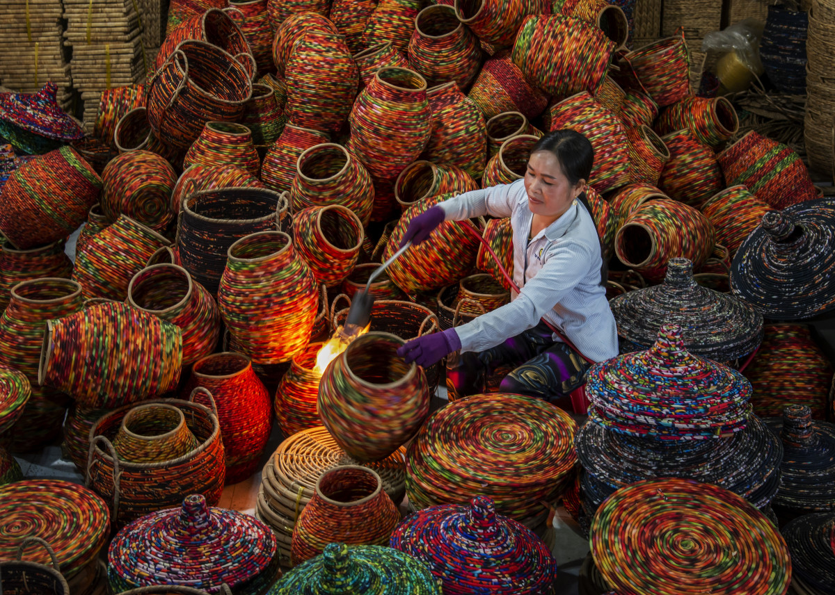 Từ cây lục bình, người dân vớt, phơi khô, cột thành bó để bán cho thương lái, kiếm thêm thu nhập. Qua bàn tay khéo léo, tỉ mẩn của những người thợ, lục bình phơi khô trở thành mặt hàng thủ công mỹ nghệ được tiêu dùng trong nước và xuất khẩu. Một sản phẩm thủ công mỹ nghệ ra đời trải qua nhiều công đoạn, trong đó, công đoạn cuối với những sản phẩm sắp hoàn thành hiện lên dưới góc máy của nhiếp ảnh gia Lê Hoàng Thái thật đẹp.